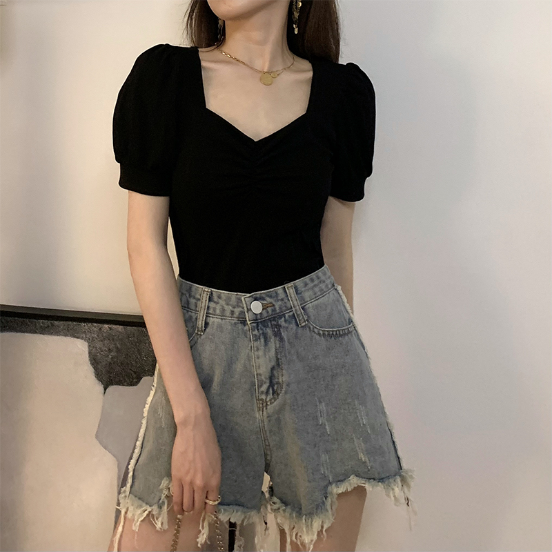法式方领泡泡短袖锁骨别致上衣女设计感小众高腰短款紧身t恤秋季热门设计联盟服务商
